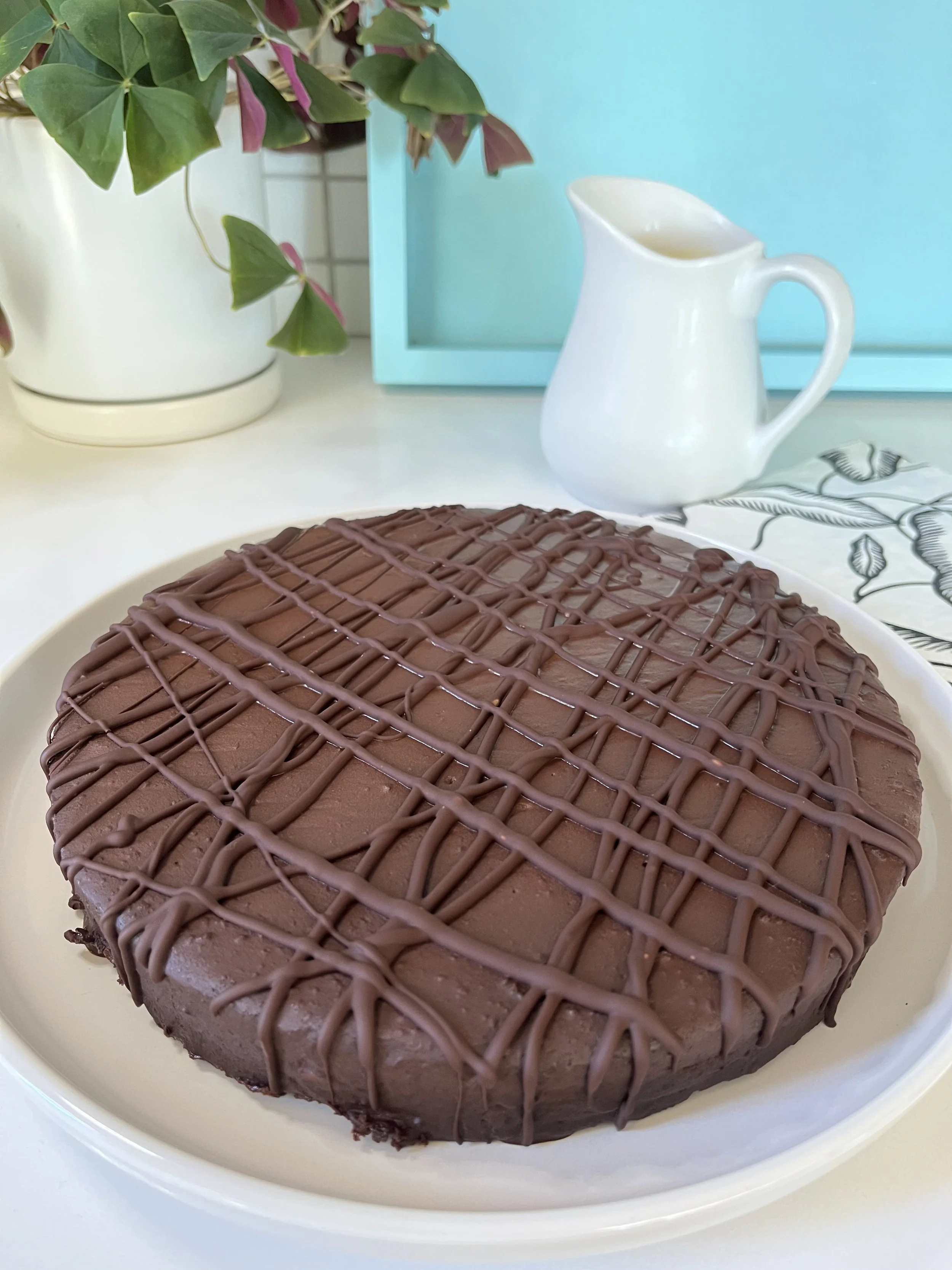 The pictured torte is covered in a semi-sweet ganache shell and drizzled with bittersweet chocolate (made by gently melting chocolate chips).