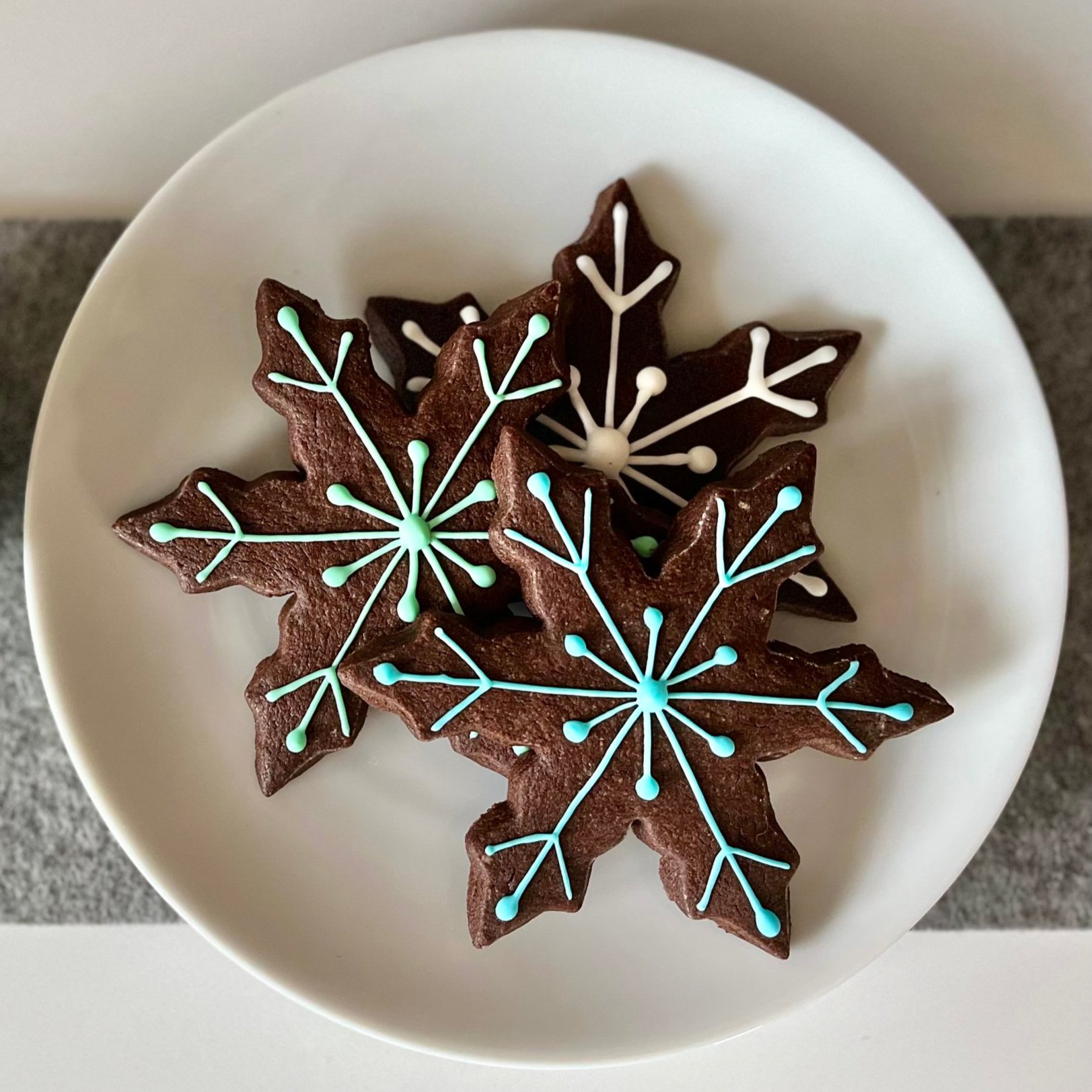 With peppermint extract in both the dough and the icing, these cut cookies have that rather perfect ‘thin mints’ flavor. Yum! This minimal decoration was at the request of sugar-conscious mamas, though the icy winter colors looked so lovely on the dark backdrop no one seemed to miss having more.