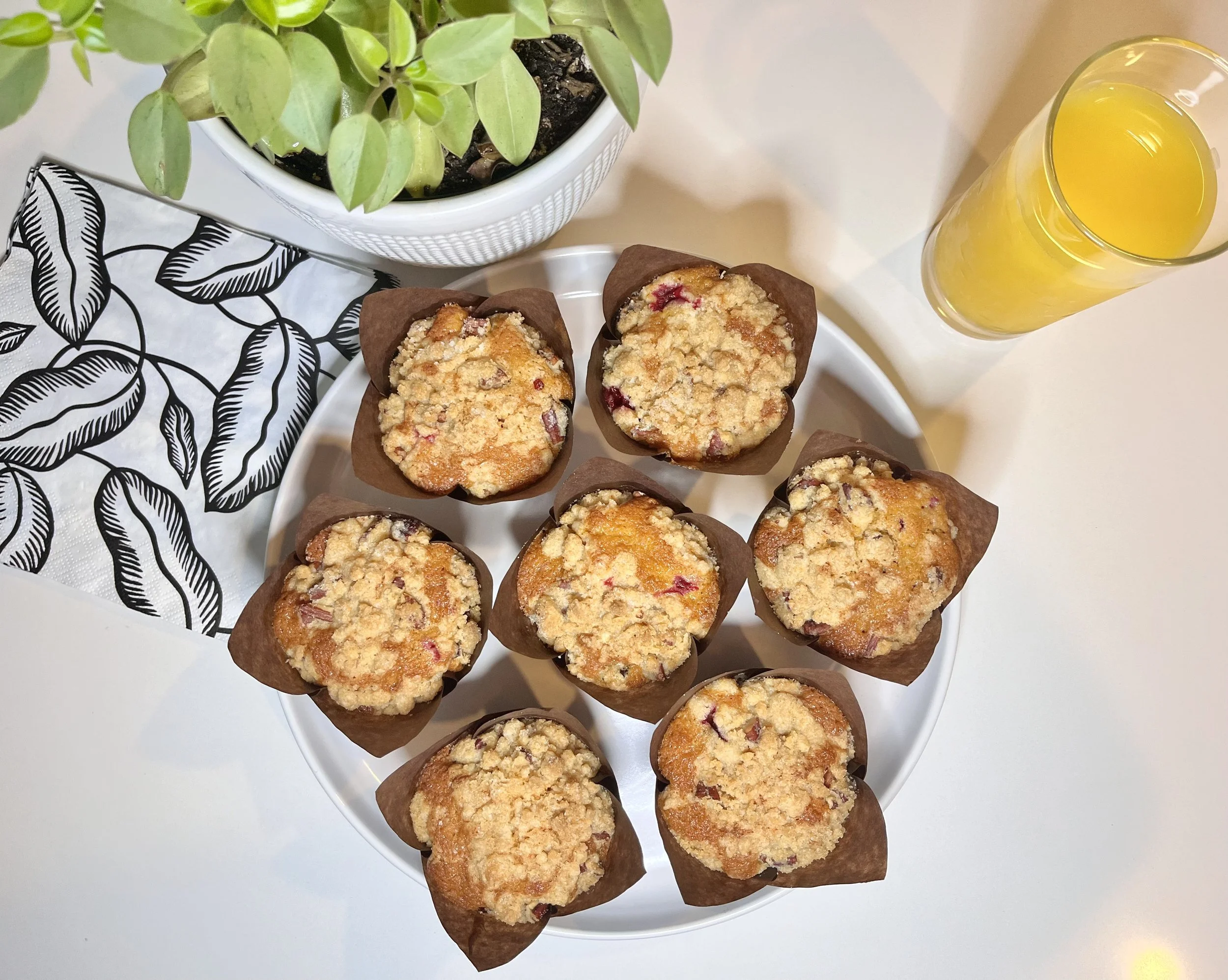 If you’re using frozen cranberries, chopping and tossing them in frozen rather than thawing first will give you prettier muffins.