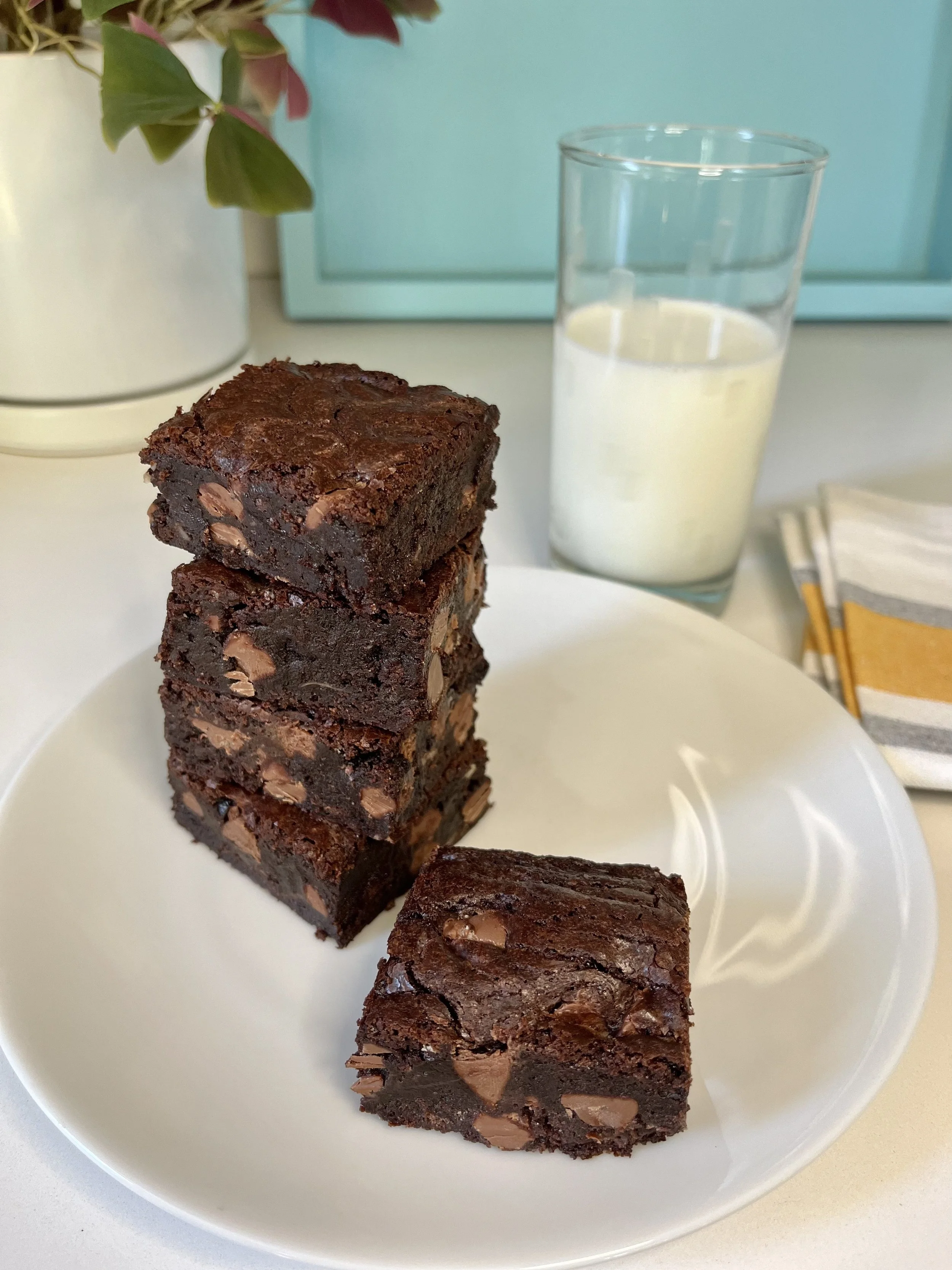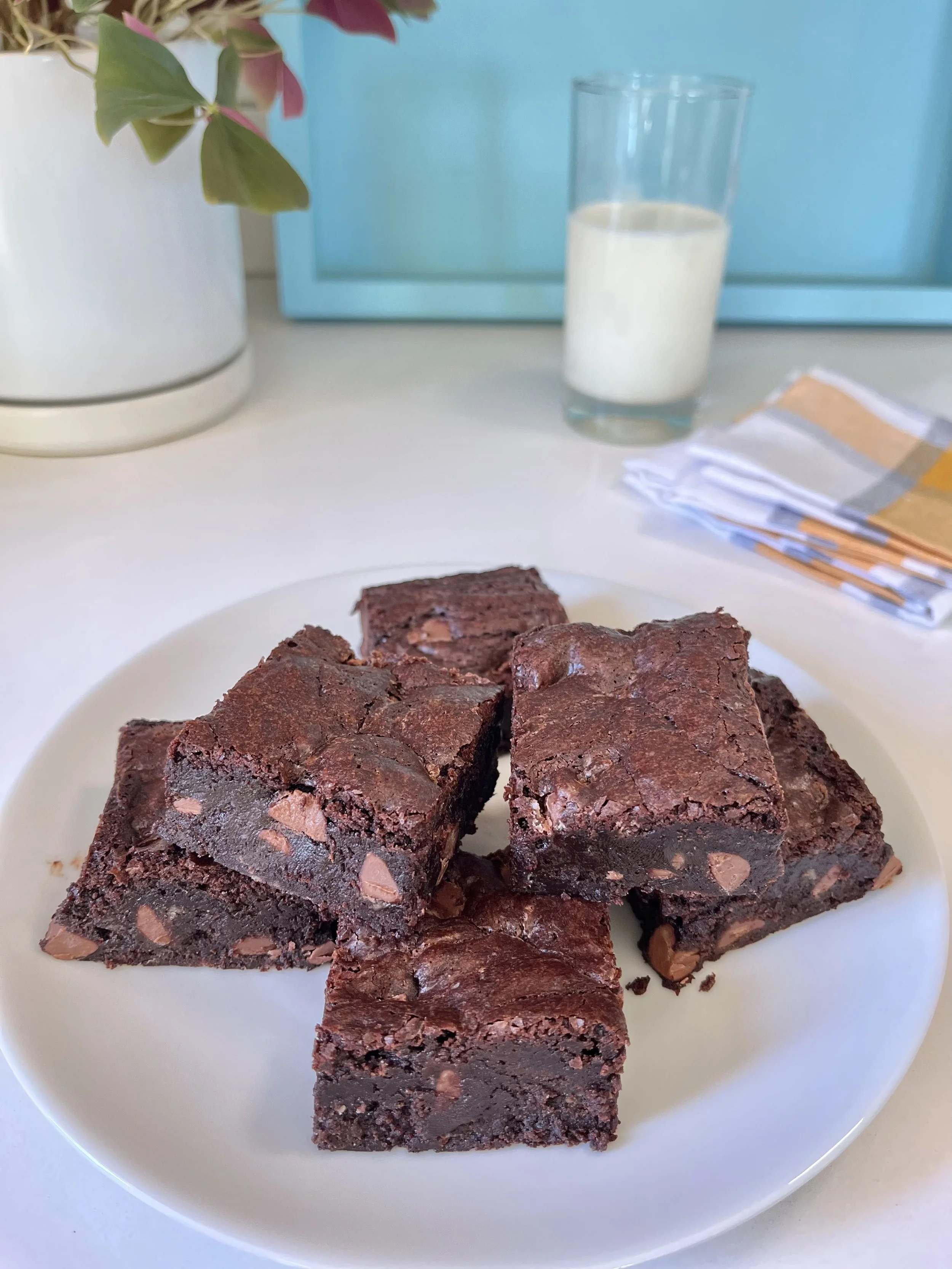 So, this is the way my little chocolate fiend likes it — dense, fudgy, decadent with chocolate on top of chocolate and nothing but chocolate. And, yes, this is now definitely his favorite brownie. (I’ve got to admit he has great taste!) And it could not be easier — one bowl (a saute pan in this case), no sifting or pre-whisking, and only 9 ingredients including the chocolate chips!