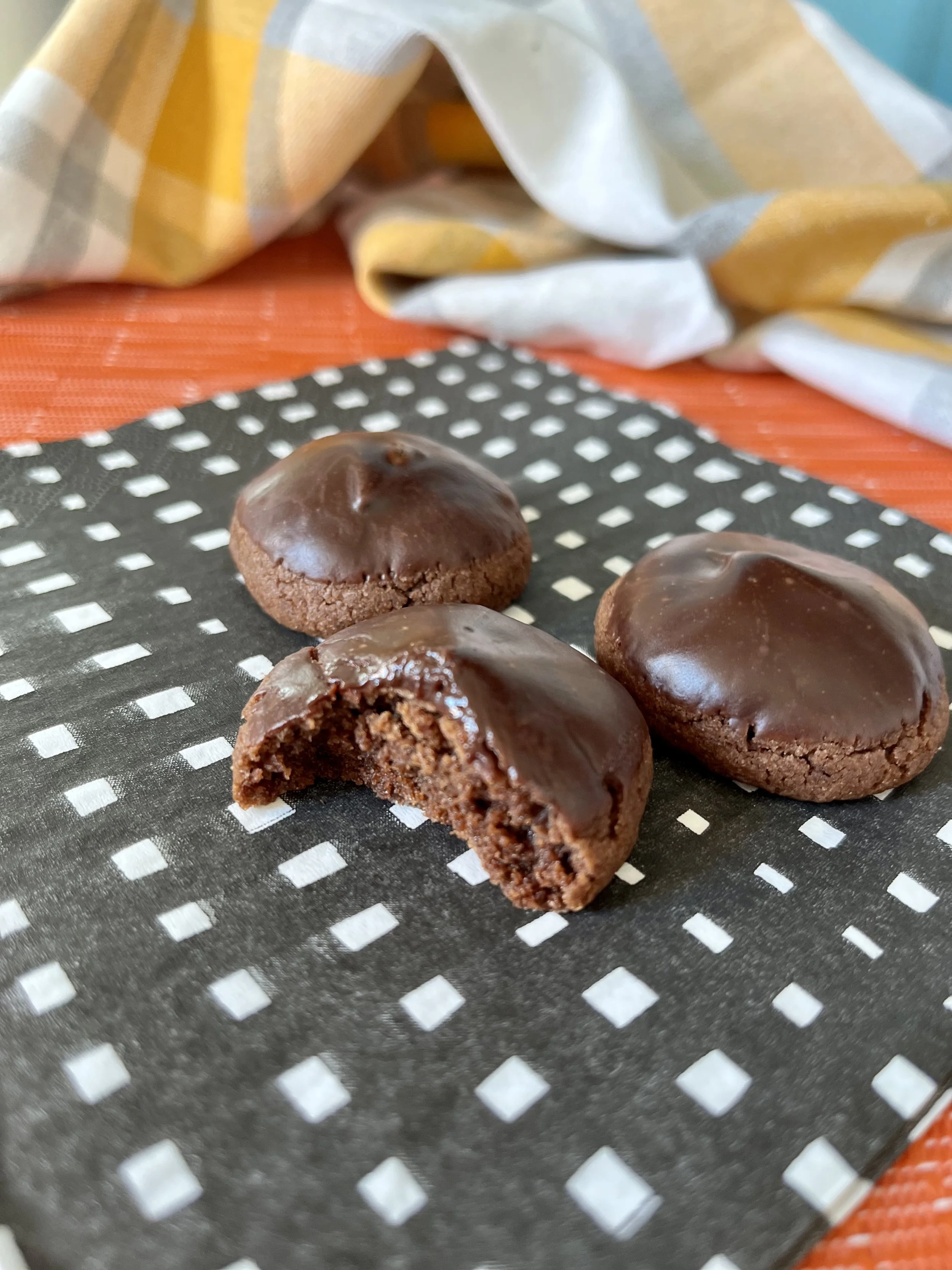Dip tops of the cookies into the ganache, allowing excess to run off before turning upright. Place on the cooling rack to set.
