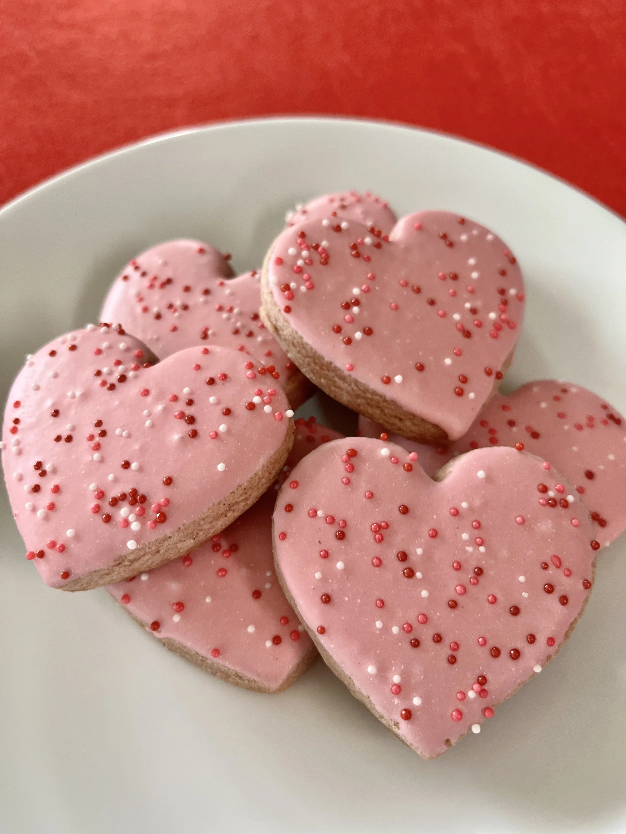 For this cookie, I dipped the tops in a white chocolate ganache (8 ounces of quality white chocolate and 6 ounces of heavy cream), allowing it to set slightly before sprinkling with nonpareils or sugar. For color, I used several drops of bright white food coloring to tone down the yellow of the white chocolate, as well as drops of deep pink and fuchsia. You could also use my recipe for Royal Icing with 1/2 teaspoon of good quality vanilla — (you’ll want the icing slightly firmer than the thickness for flooding).